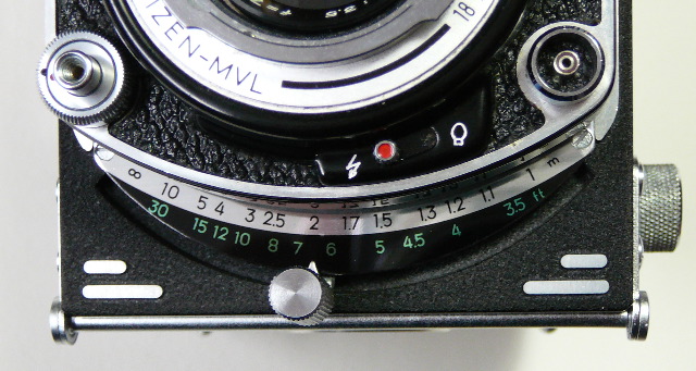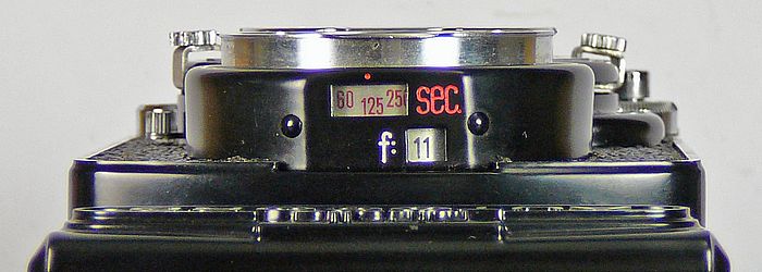 Das Einstellen von Zeiten und Blenden geschieht über Hebel, die links und rechts um das Objektiv herumgeführt werden. Die beiden Belichtungswerte werden von oben in den kleinen Fenstern über dem Sucherobjektiv abgelesen. An der Position des Blendenhebels kann neben dem Objektiv der Lichtwert abgelesen werden, der sich aus der Kombination mit der eingestellten Belichtungszeit ergibt. Blende und Zeit sind aber nicht gekoppelt, so dass ein eingestellter Lichtwert nicht fixiert mitgenommen werden kann. | ![]() |